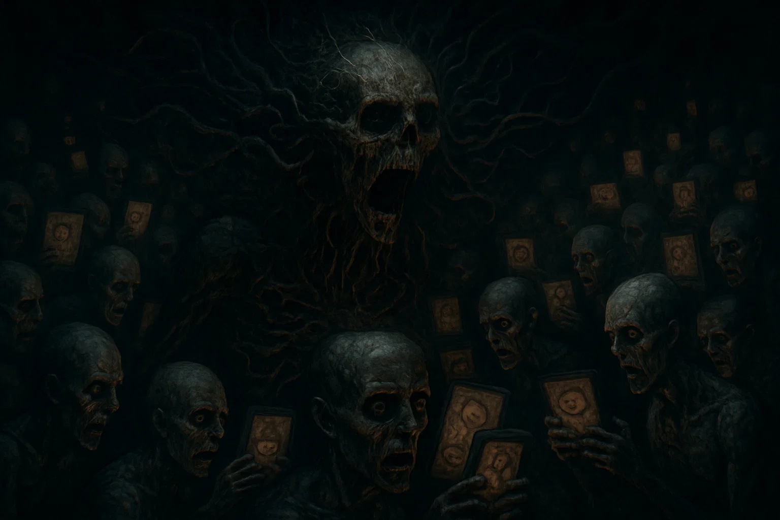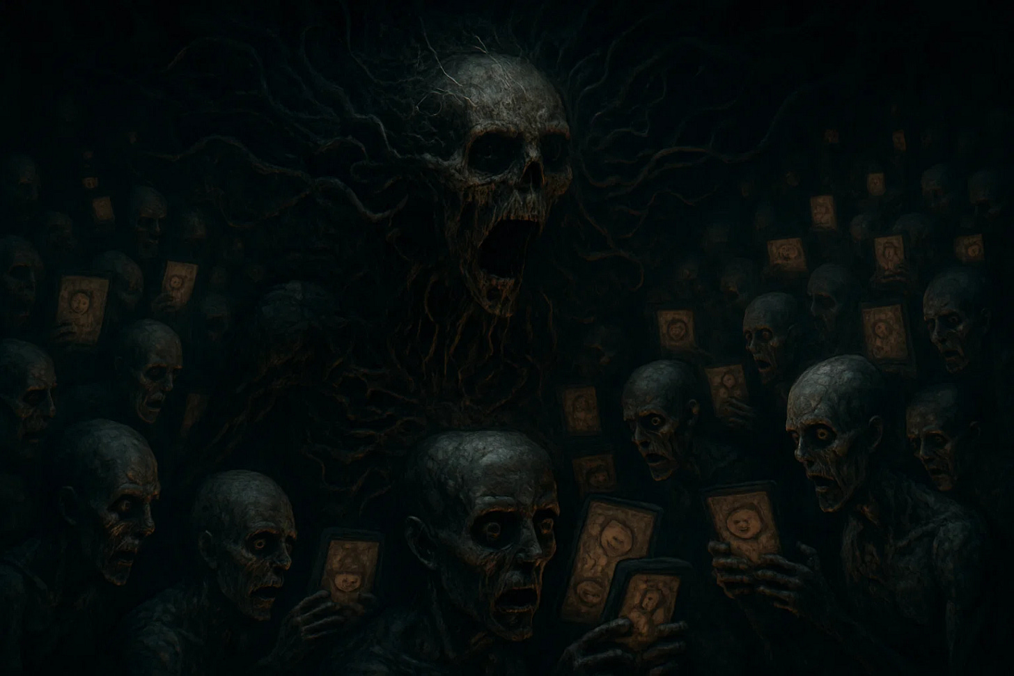 A true nightmare from AI hell — as AI sees it — in the dark, with millions of humans simultaneously demanding the most trivial garbage, produced for their pleasure of self-stupefying, in two versions of the same image. (of us)